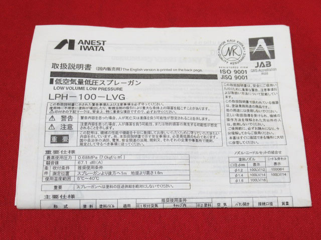 ANEST IWATA アネスト岩田 低圧スプレーガン LPH-100 LVG カップ 取扱説明書付き スプレーガン 工具 管理7N0919Fをヤフオクで探す